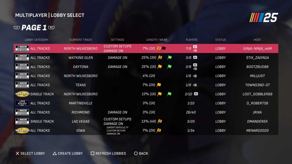 You have no choice but to scroll through pages of spreadsheets listing empty lobbies in a server browser, hoping and praying to find something that looks like it has a chance of more than a handful of drivers to a race. It’s an ancient, outdated interface, and it lacks even basic filters. I understand that NASCAR fans are nostalgic for the early 2000s, but this is ridiculous.