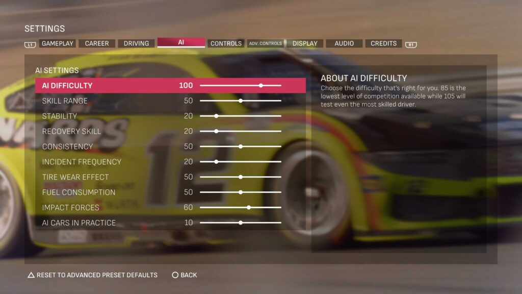 For a lot of NASCAR fans, playing Settings Menu 25 won’t be a problem, especially concerning car setups. In fact, the extensive customization of options is likely a selling feature for some. Spending hours adjusting tiny percentages of camber to get it feeling just right? Welcome to Larry Mac’s whole life! But the audio mixing? The minute idiosyncrasies of AI behavior? These are fairly esoteric and inaccessible settings to not have extremely clear and intuitive presets for.
