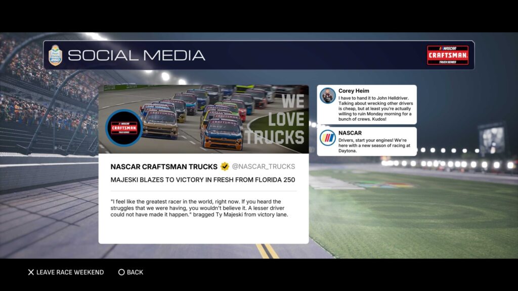 The Career Mode also has in-character social media posts from drivers and personalities following each race. This is an interesting idea, but it is poorly implemented. The posts are eyerollingly generic and appear to have been generated by AI. Which feels wrong, because there are also so few of them that you’ll see duplicate posts within just your first season of ARCA. If it’s AI-generated, why not just make thousands of possible posts?