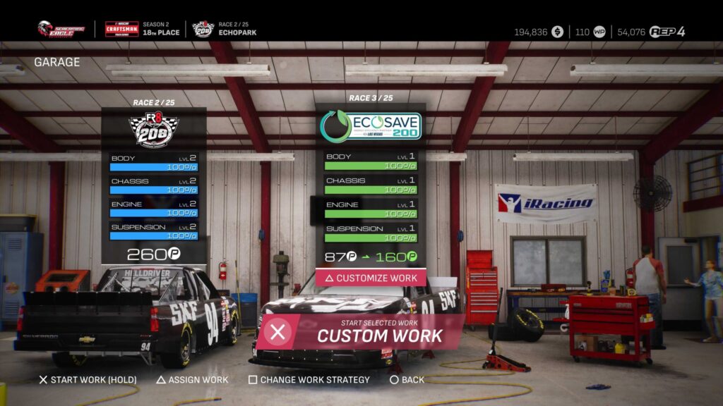 But if your choice and economy systems come down to either picking the easy right answer or just not engaging with it at all, that’s a sign it probably isn’t working. It’s not a choice if there’s always one right answer, and it isn’t an economy if you never have to make a trade-off in your decisions. What’s really painful about all of this is just how much they nailed the Race Shop vibe and atmosphere. I want to hear the tools, I want to listen to the radio on a dusty old boombox, I want to be here making interesting decisions. But it never goes anywhere.