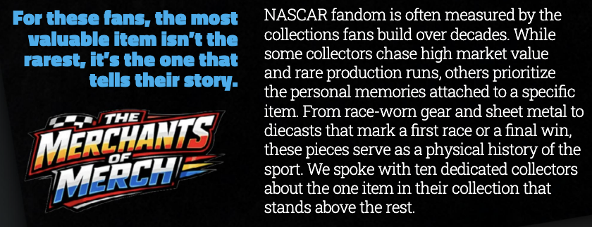 - We also sat down with some of the NASCAR community’s many collectors. Look out for the Collectors Crown Jewel article in the back to take a look at some personal, unique, and otherwise prized items in these fans’ collections.