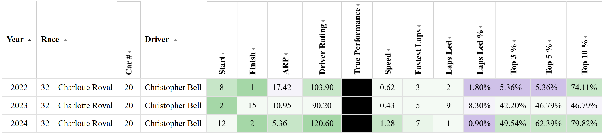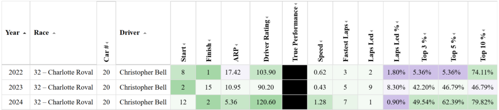 Loop Edge data for Christopher Bell at the Charlotte Roval in the Gen 7 car (2022-present) (Win The Race)