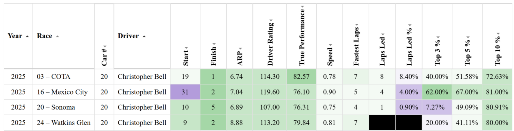 Loop Edge data for Christopher Bell at road courses in 2025 (Win The Race)