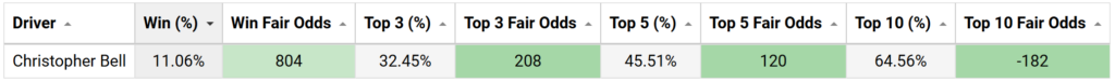 SIM FMV odds for Christopher Bell to Win and finish Top 3/5/10 (Win The Race)