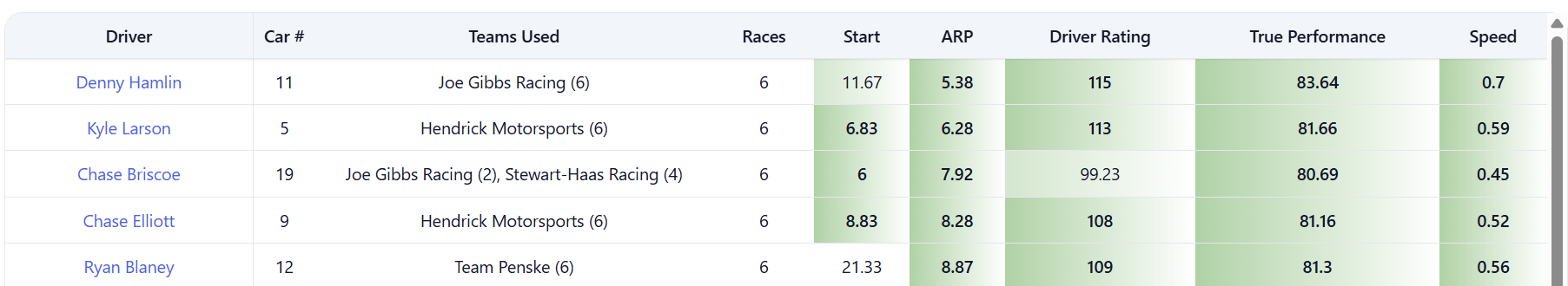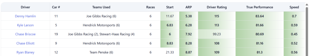 Denny Hamlin and Kyle Larson lead all drivers in average running position at the track over the past three years. Despite having to start in the thirties three times during this period Ryan Blaney is fifth in average running position among active drivers, behind Chase Elliott in fourth. Additionally, Blaney, Elliott, Hamlin, and Larson, are the top four drivers in True Performance and incident adjusted speed (proprietary metrics from Win The Race) over the past three years.