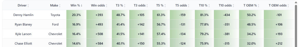 At Caesars and Bet365 the odds offered on the Under 16.5 group, which adds in quite a few other drivers who have had success at Martinsville (critically adding Ross Chastain and Brad Keselsowski) we are getting odds of just -130. The implied odds of -130 mean that we would need to win this bet just 56.52% of the time to break even. That means that even if our simulation is too high on our favorites we have a ton of room to be wrong and still have value on this bet. While I wouldn’t bet it all the way to -214, I do think there is value on this number down to -175.