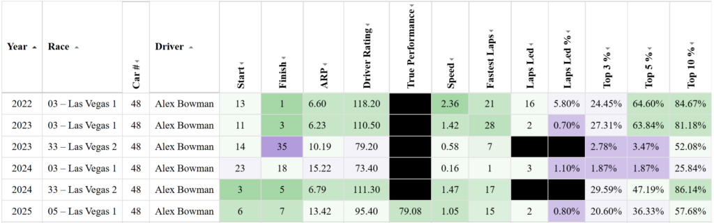 That said, one bad day doesn’t change my opinion about Bowman being likely to come out strong at this type of track. Bowman has been outstanding at Las Vegas in the Gen 7 car. He has finished inside the Top 10 in four of his six starts here. That includes a seventh place finish here in the spring. Only once has he failed to log over 50% of his laps inside the Top 10.