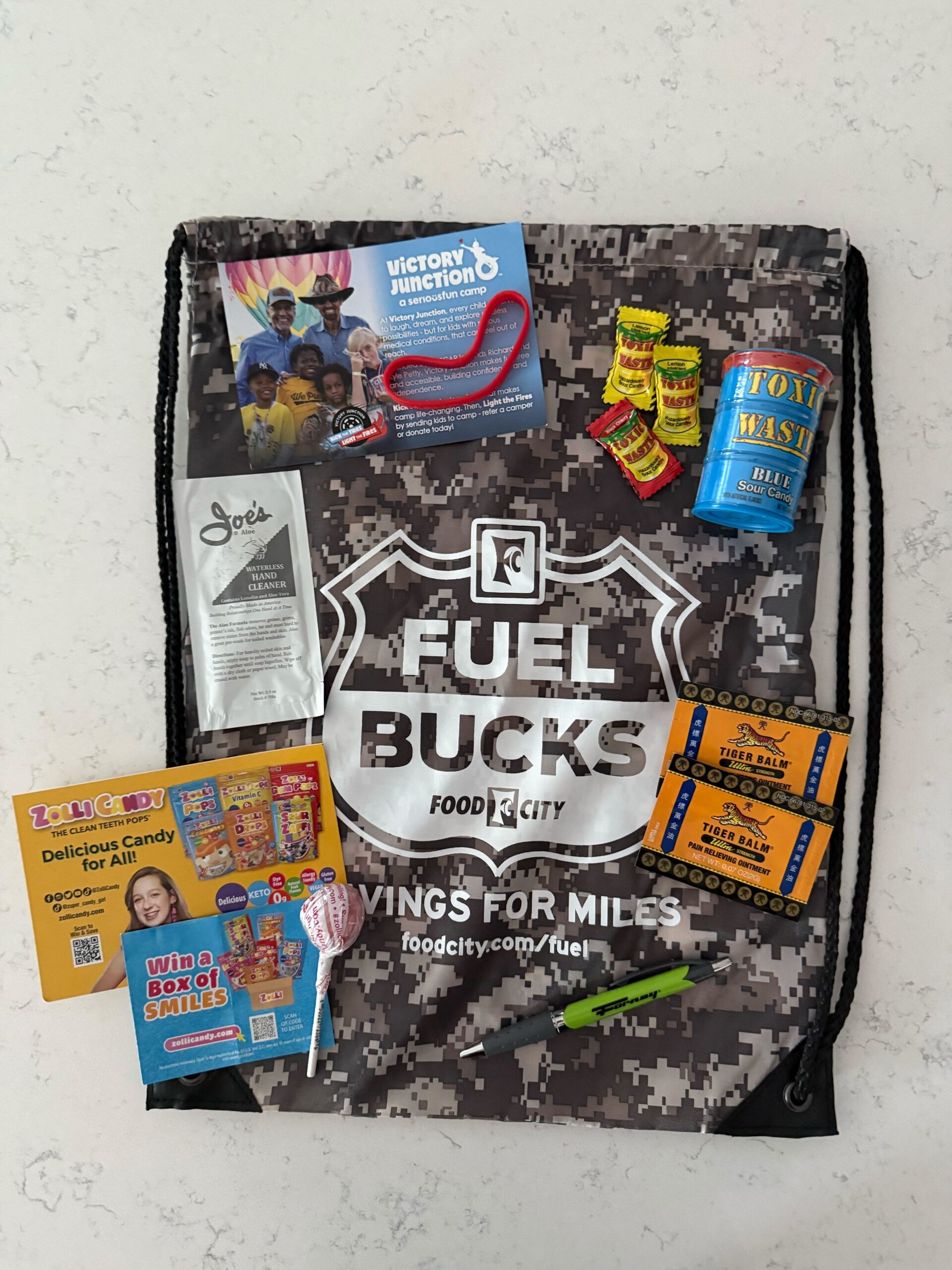 On Friday and Saturday, swing by the Daily Downforce tent to score this first-of-a-kind camo Food City Fuel Bucks string bag packed with FREE samples from our friends at Forney Industries, Joe’s Hand Cleaner, Tiger Balm, Toxic Waste Sour Candy, Victory Junction, and Zolli Candy.