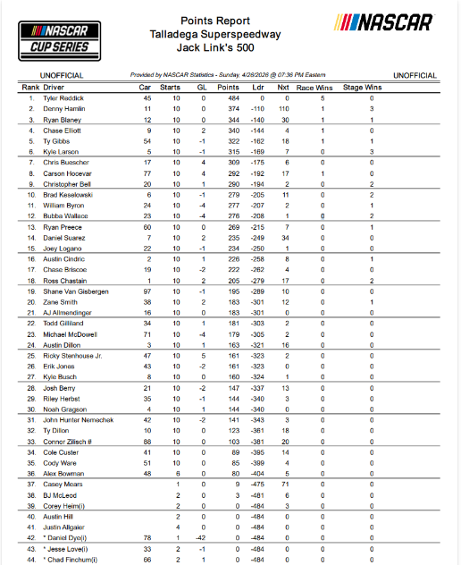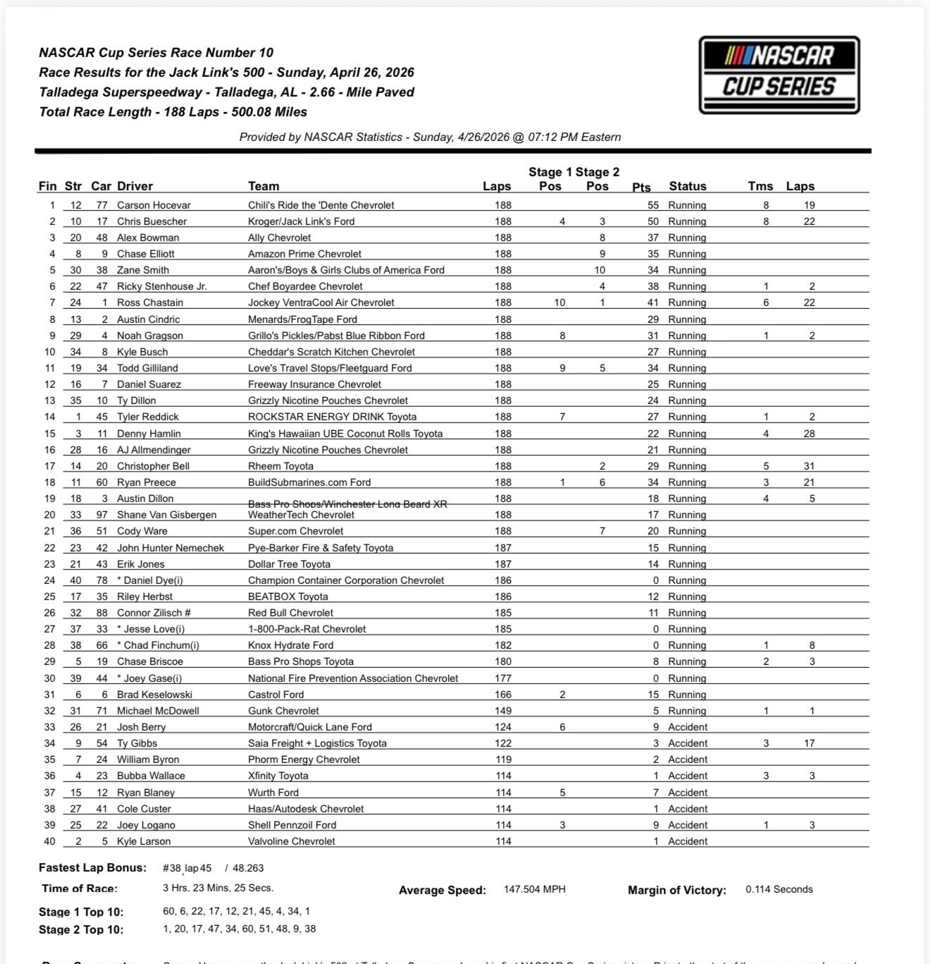 • Carson Hocevar scores his first career NASCAR Cup Series victory, Spire’s second as an organization. This comes after some strong runs to end the 2025 season and to begin the 2026 season. To celebrate his victory, he drove a victory lap while hanging out the window and saluting the sold-out crowd at Talladega.