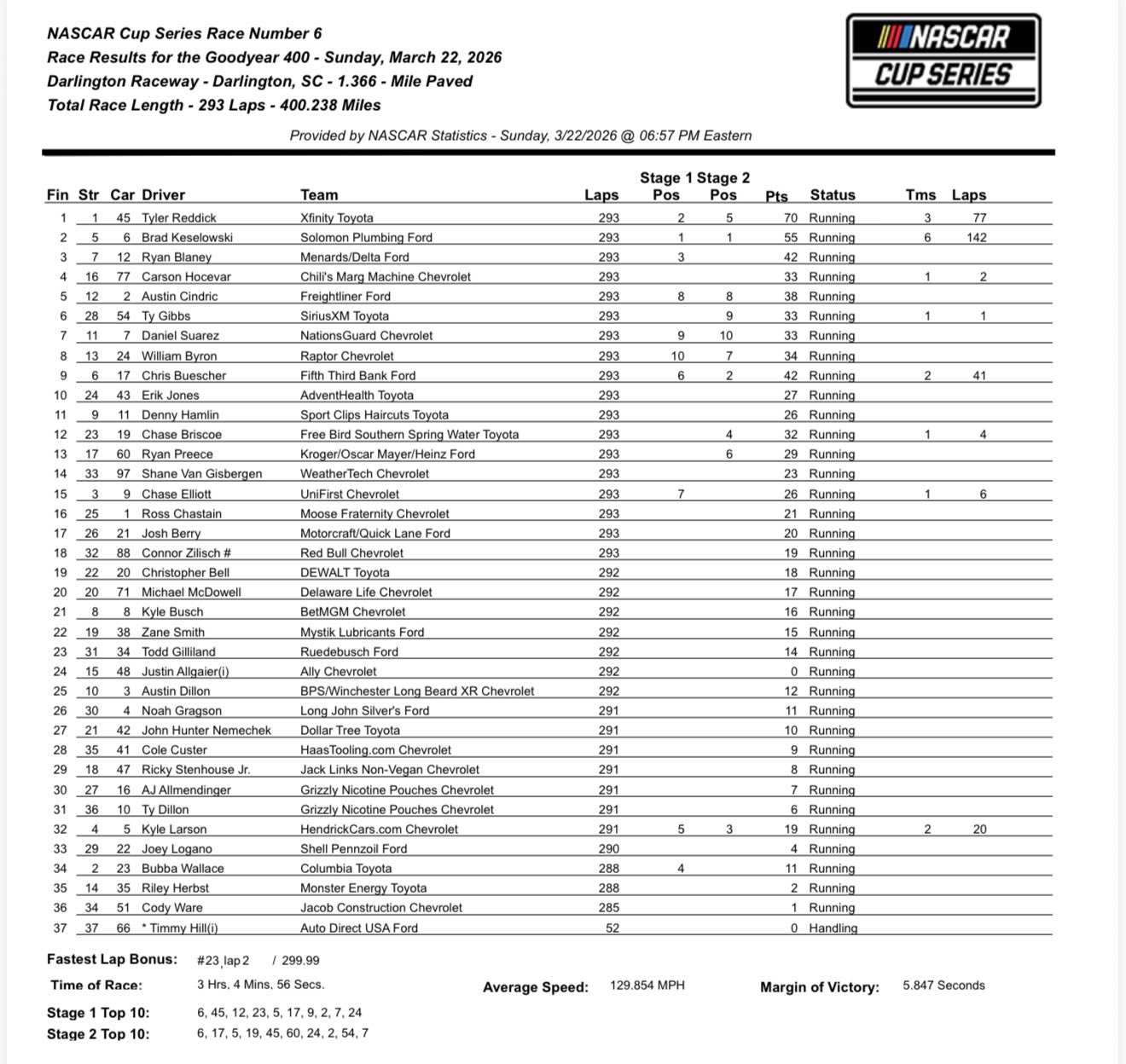 - The second stage also belonged to Brad Keselowski, who led a bulk of it over his teammate Chris Buescher. In the closing laps of the second stage, Buescher’s No. 17 RFK Ford came to life as he chased down his teammate, Bad Brad. Though he wasn’t able to pass Keselowski for the stage win, it did appear that he had the car to beat late in the going in Darlington.