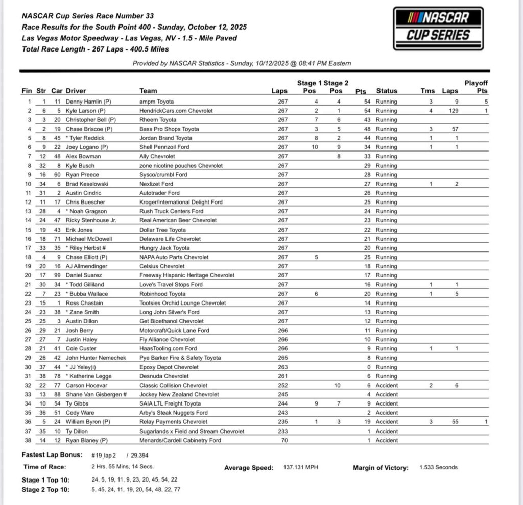 The NASCAR Cup Series headed to the Las Vegas Motor Speedway for the opening race of the Round of 8. Joe Gibbs Racing and Hendrick Motorsports dominated qualifying, with Hamlin snatching pole position over Chase Briscoe and Christopher Bell, while HMS’s playoff trio of Elliott, Byron and Larson were 4 through 6, completing the top 6 sweep for the two dominant teams. The Penske playoff drivers Joey Logano and Ryan Blaney started 9th and 14th respectively.