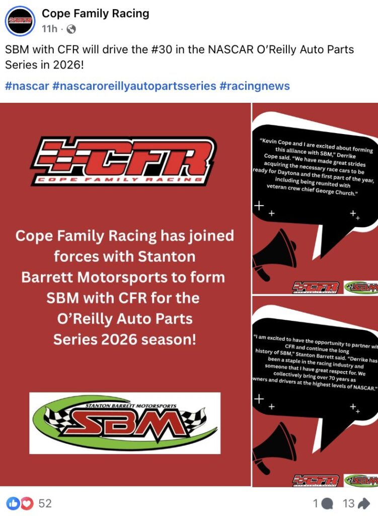 Stanton Barrett Motorsports is set to return to the NASCAR O’Reilly Auto Parts Series for the first time since 2008 through a new partnership with Cope Family Racing.