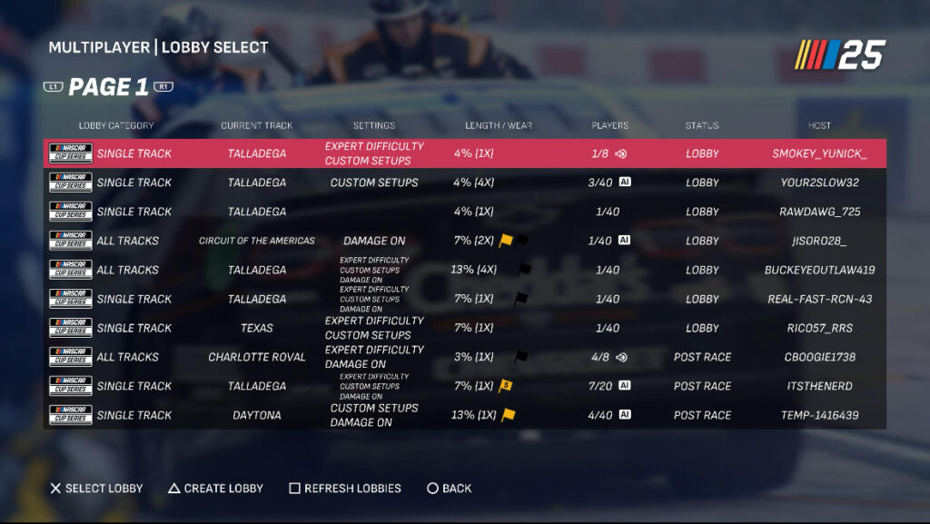 While many had hoped for the addition of a matchmaking feature to NASCAR 25, much like past games in the NASCAR lineup, NASCAR 25 features a server browser.