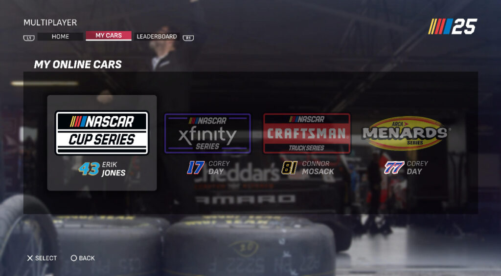 Before you hop in a lobby, you will want to select your car. You can access this under the My Cars tab and select one car from each of the four NASCAR National Series, including any DLC cars you may have in your game.