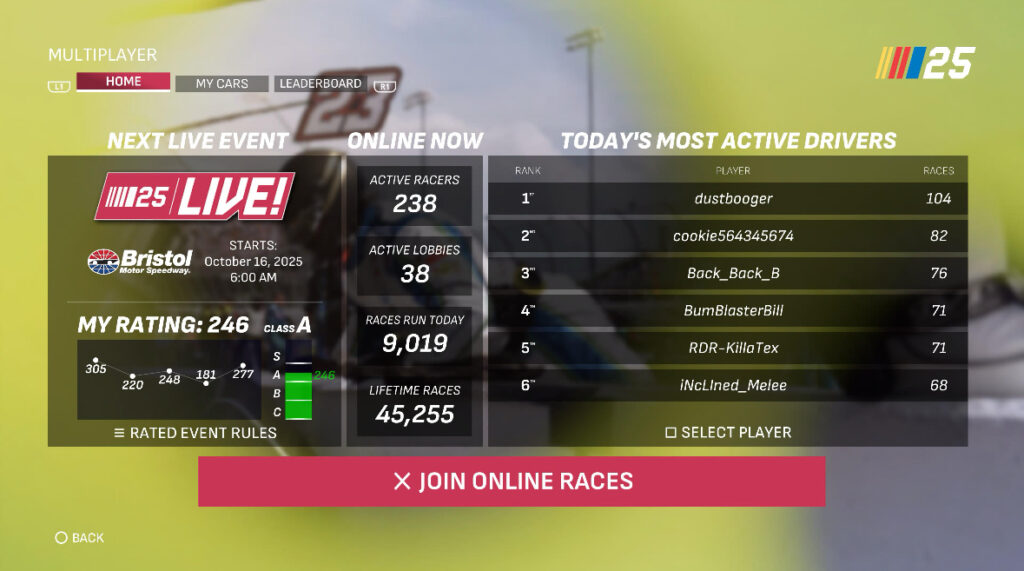 To access NASCAR 25 online, players must select the online option on the game’s home screen. After connecting to the servers, you will then be greeted by the online hub.