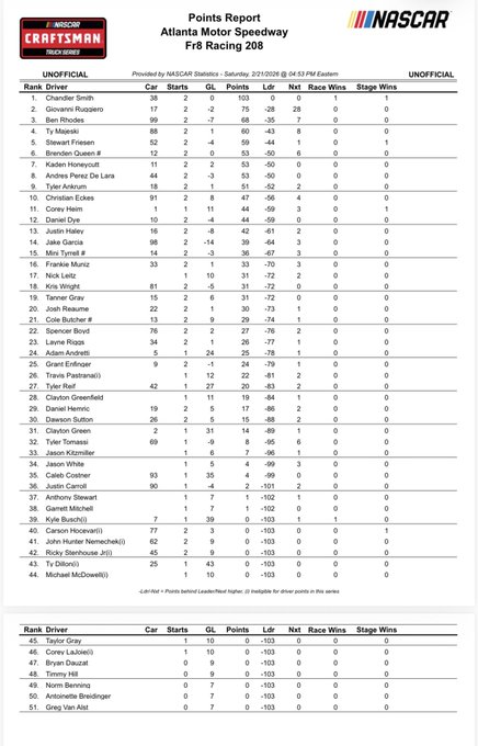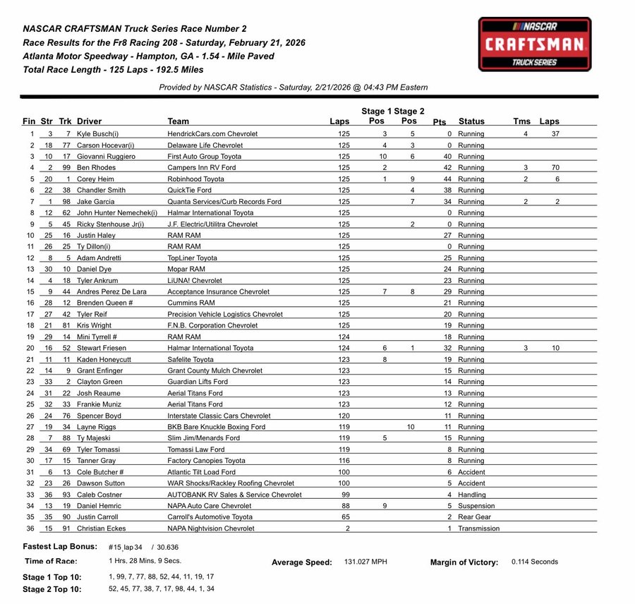 Prior to this race, it was already announced that Kahne would not be returning to HMS for the 2018 season and that he would be replaced by up-and-comer William Byron. This victory was Kahne’s final hurrah and was what turned out to be the final win of his career. He started 19th and led 12 laps at the end of the race, holding off Brad Keselowski for the victory.