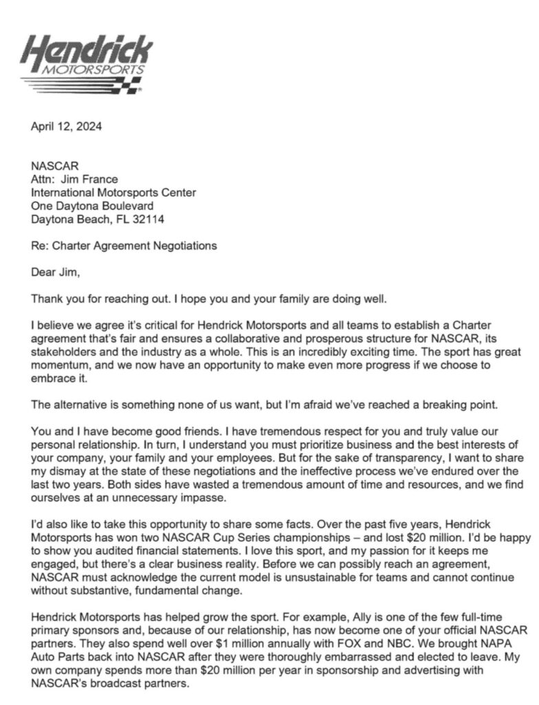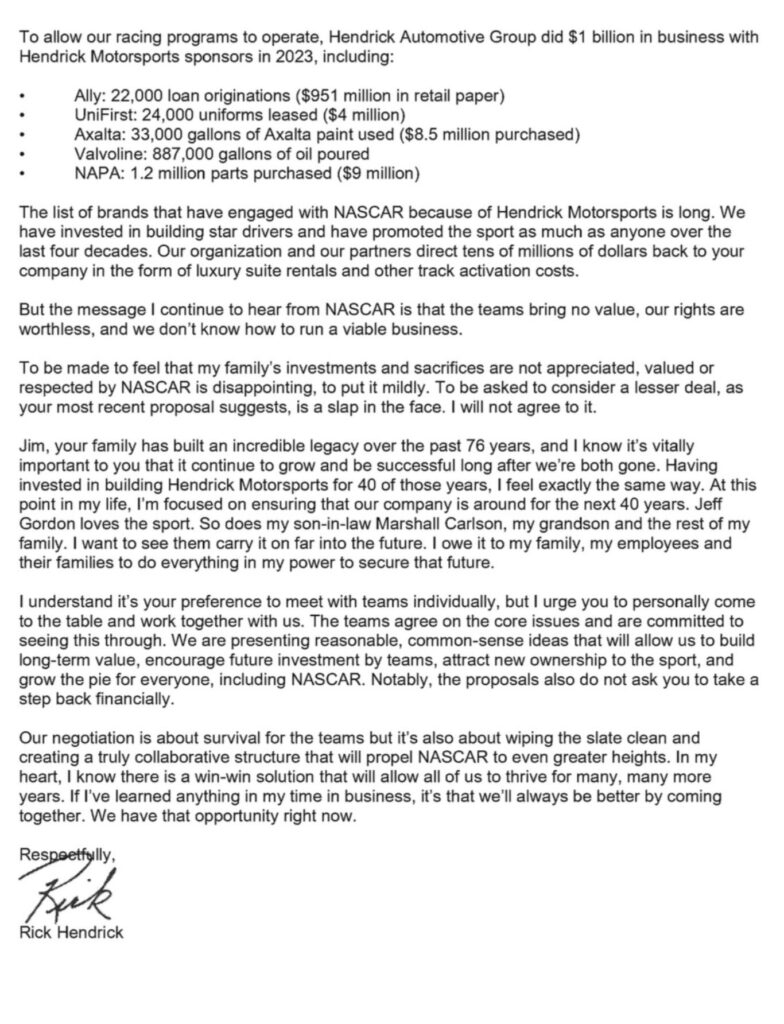 Hendrick also implores France and NASCAR to explore a more collaborative financial model for the future of the sport. For example, the letter gets straight to this point, with Hendrick saying in the first full paragraph: