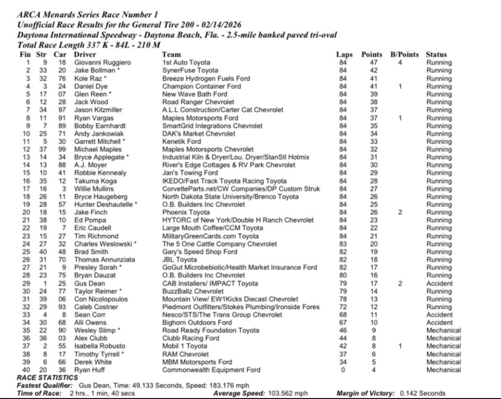 • This race marked McFarland’s fifth start in the series, his best being a 9th at Charlotte last year. The rest of his schedule is still to be determined. But surely, he’ll make more starts in the ARCA and Truck series throughout the year as he continues his quest to one day run in the Great American Race.