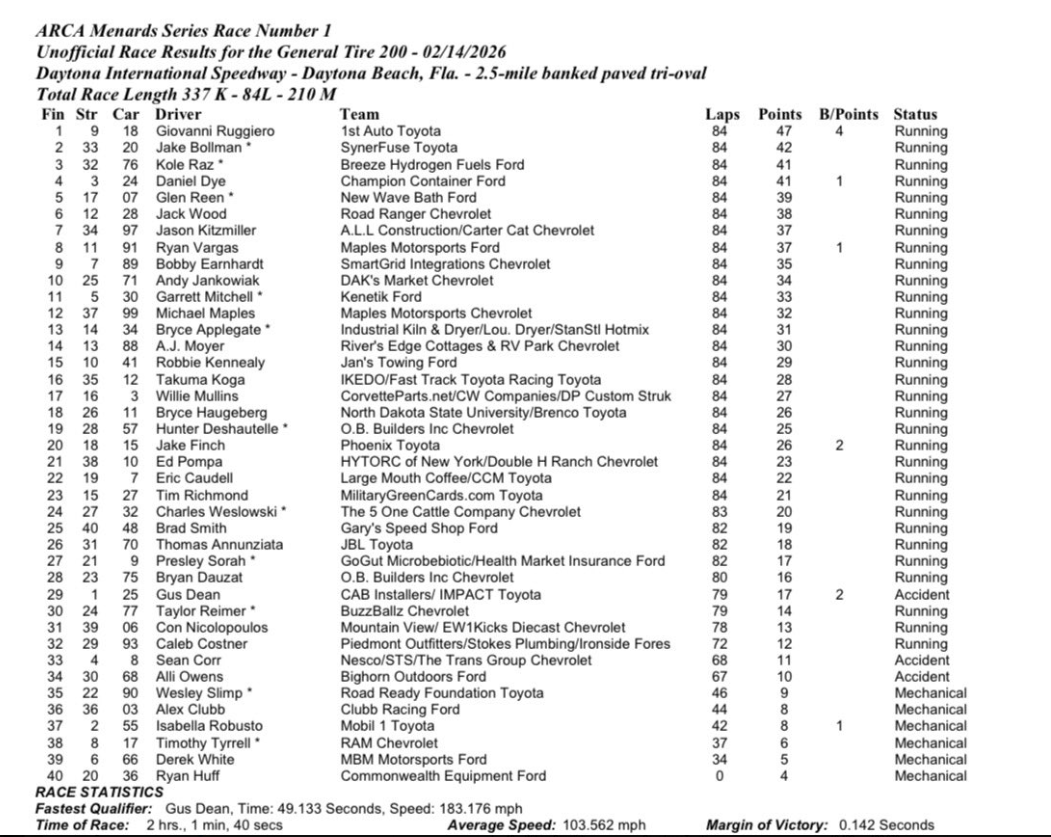 • This race marked McFarland’s fifth start in the series, his best being a 9th at Charlotte last year. The rest of his schedule is still to be determined. But surely, he’ll make more starts in the ARCA and Truck series throughout the year as he continues his quest to one day run in the Great American Race.