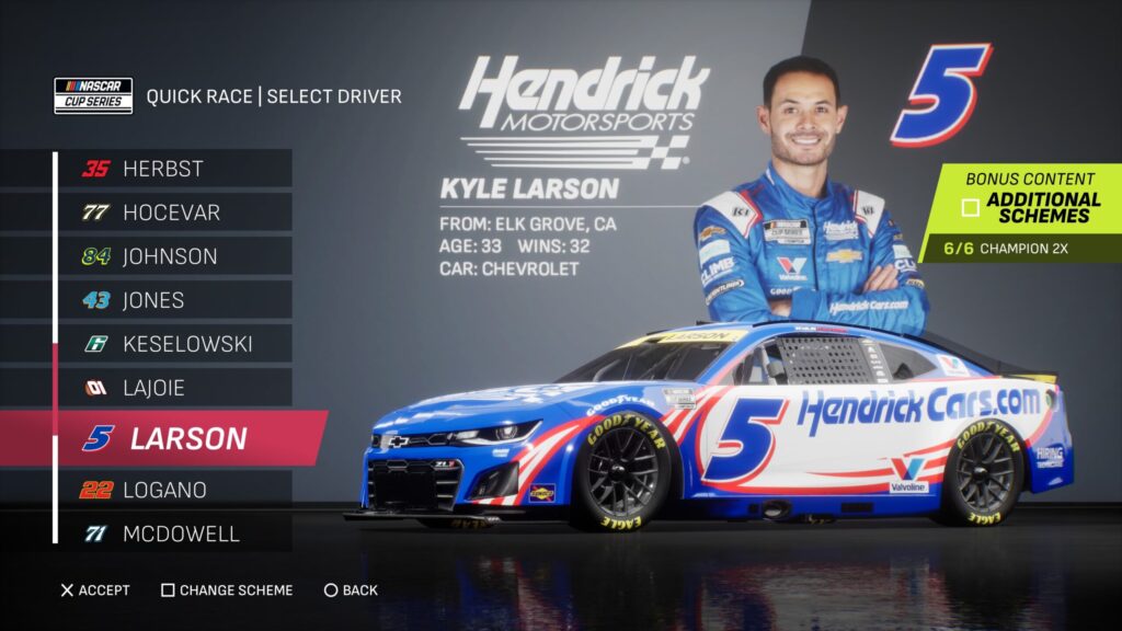 These paint schemes are all focused on the 2025 NASCAR Cup Series Champion, Kyle Larson, and include the game’s first-ever playoff-specific paint scheme.