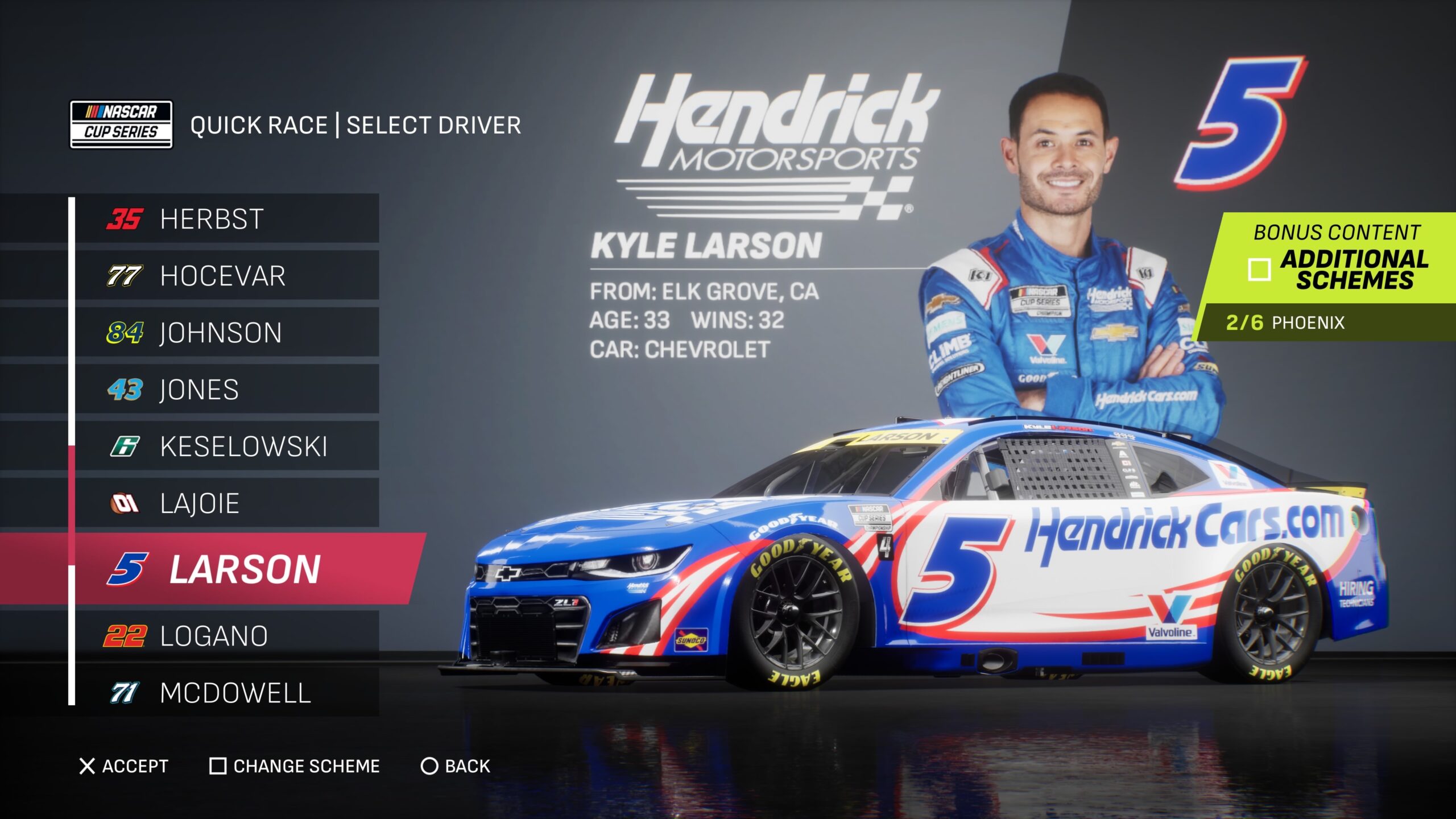 These paint schemes are all focused on the 2025 NASCAR Cup Series Champion, Kyle Larson, and include the game’s first-ever playoff-specific paint scheme.
