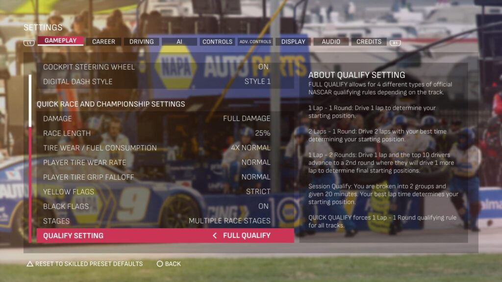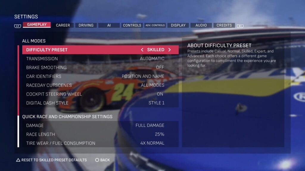 For any veterans of NASCAR gaming, NASCAR 25’s Gameplay settings are familiar, but with a few extra settings.