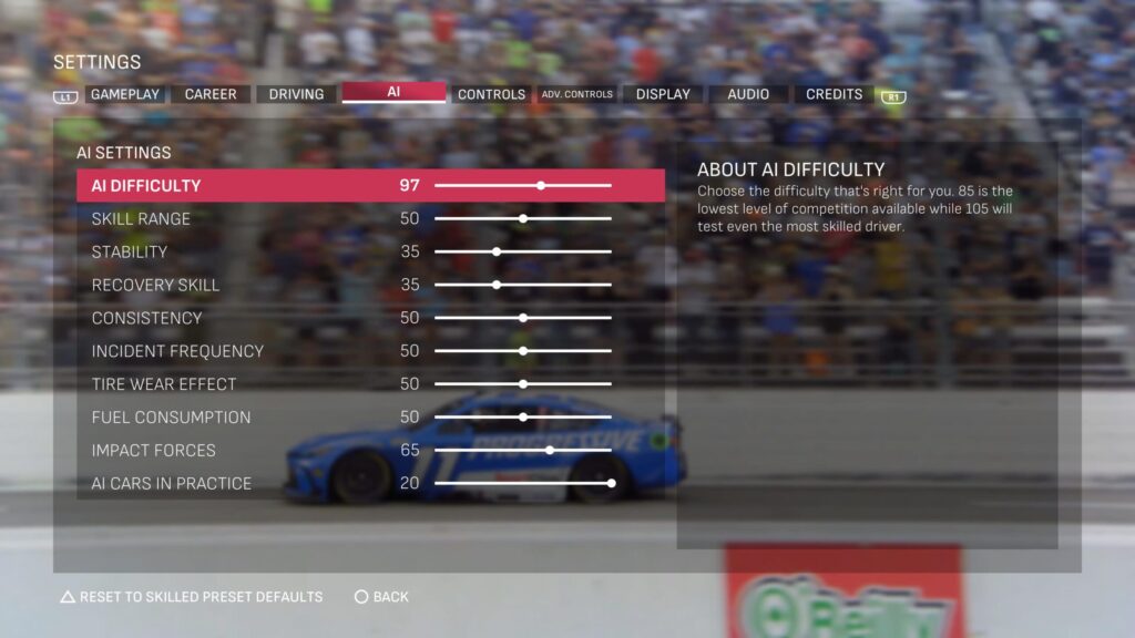 Among these settings are the usual options you would see in past NASCAR games for their CPU or AI races, such as AI Difficulty, on a scale of 85 to 105, and settings that are similar to players’ own in-game settings, such as AI Stability and AI Recovery (specifically in regards to contact). In contrast, the Impact Forces option determines how players are affected by contact with AI on their end, in this case, the higher the number, the more crucial the impact.