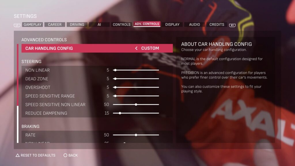 To customize these, ensure that you switch Car Handling Config to Custom. These settings can be tricky and are based on how you want the car to react to your input on the controller.