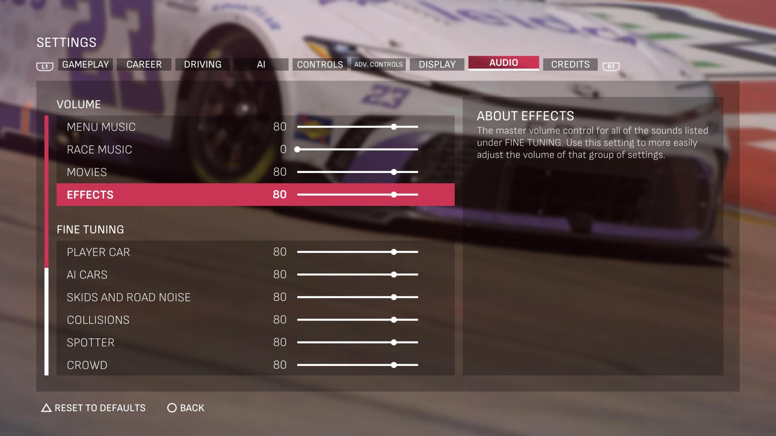 Under the audio settings, players can adjust the volume for in-game clips, such as Dale Jr. Download clips in career mode, the menu music, and toggle music while you’re at the track.