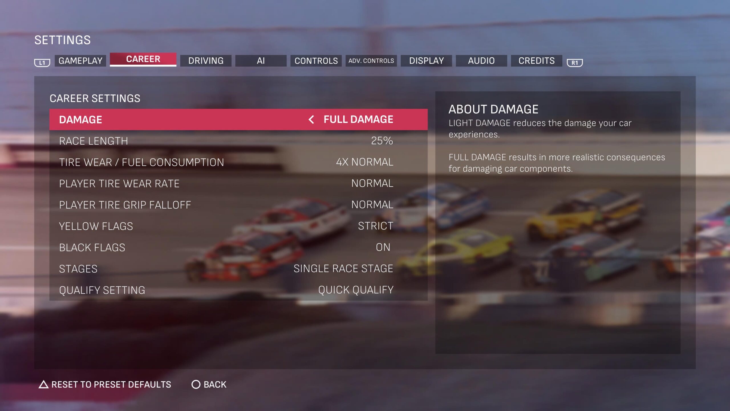 These settings under the gameplay tab are for your quick race and championship mode, though it will automatically make similar changes to your career mode settings under the “Career” tab.