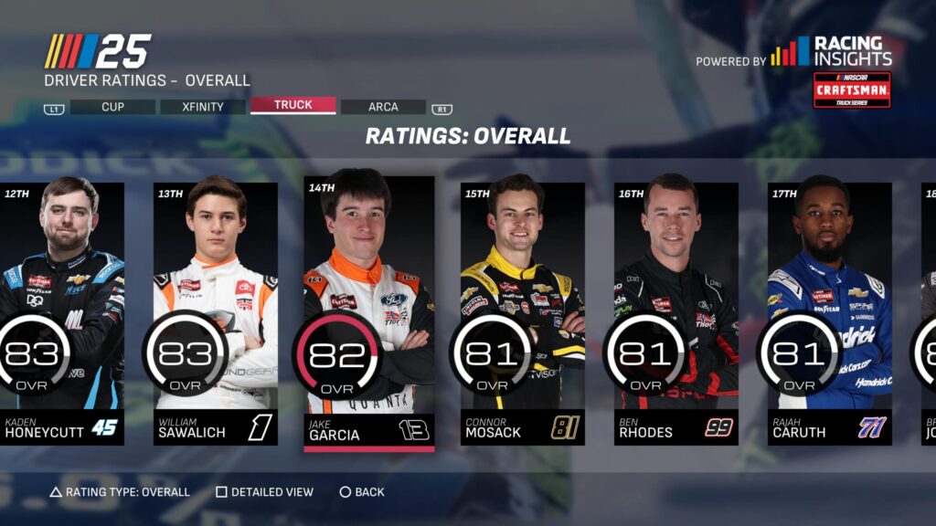 The overall rating also sets a ranking for each Series. Following Tuesday night’s update, NASCAR 25 adjusted drivers’ overall ratings in all series except the NASCAR Xfinity Series, thereby updating their rankings in the game.