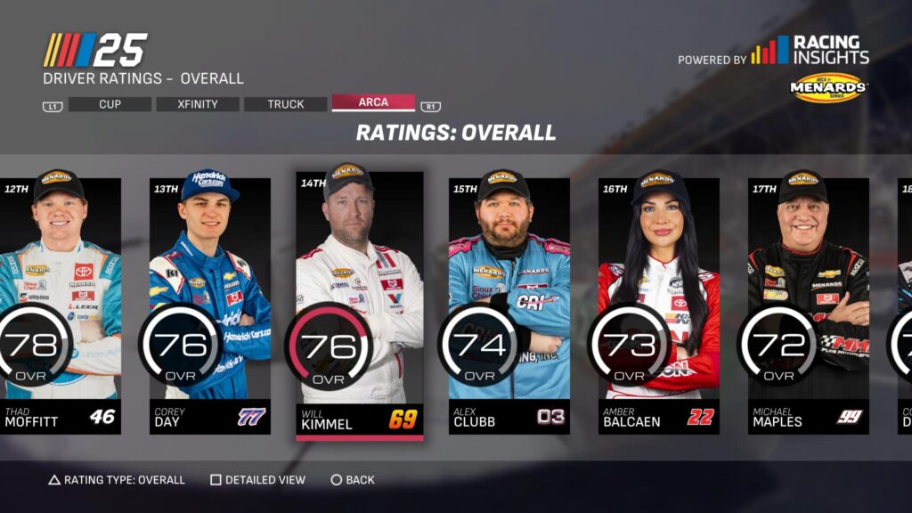For NASCAR 25, iRacing made driver ratings a key function, utilizing in-depth driver data from Racing Insights, likely combined with base statistics, to establish independent ratings for drivers on Speedways, Superspeedways, Intermediate, Short Intermediate, Concrete, and Road Courses.