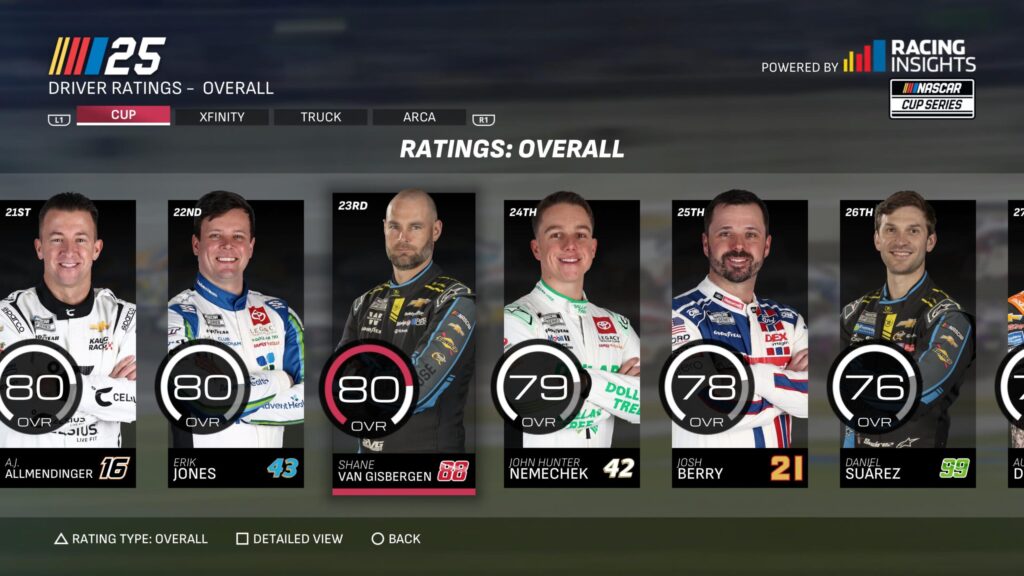 The largest jump came from Trackhouse Racing’s Shane van Gisbergen, who went from a 72 overall to an 82 overall, skyrocketing from the 29th-best Cup Series driver to the 23rd-best Cup Series driver in NASCAR 25.