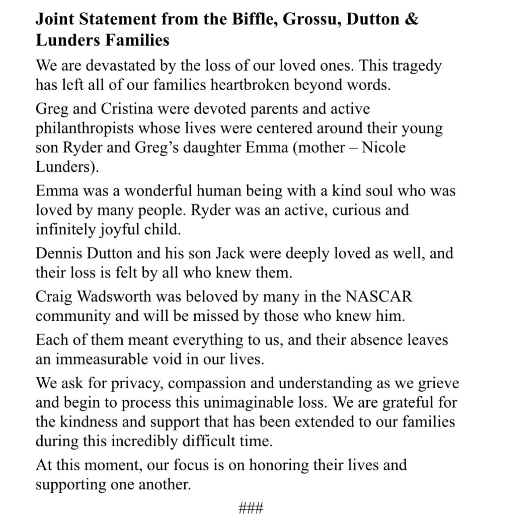 Late that afternoon, the families of those involved confirmed seven total casualties, including the four members of the Biffle family, alongside Dennis Dutton, his son Jack Dutton, and Craig Wadsworth.