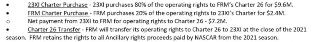 This section includes a transaction in which 23XI would acquire 80% of an FRM charter, with an option to purchase an additional FRM charter by late 2022. In return, FRM would purchase 20% of a 23XI charter.
