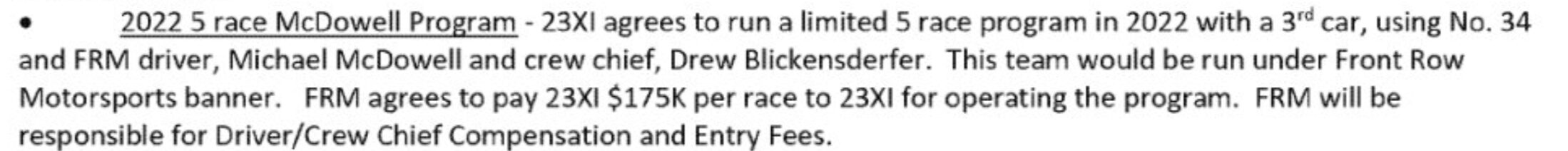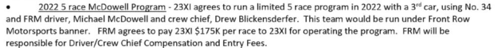What is most notable in this listing is the mention of a “5 race McDowell Program,” which would see 23XI field Michael McDowell, then signed with FRM, in five races in a third part-time car in 2022. However, this car would be under the FRM banner and paid for by FRM.