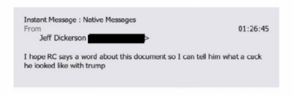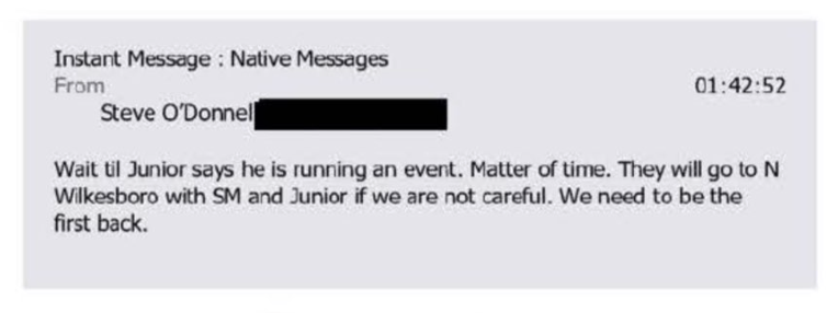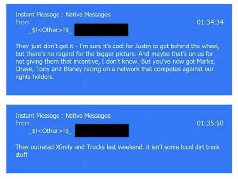 His mentions in these messages have mostly centred on two interactions, both with a redacted individual or individuals, one involving Richard Childress Racing owner Richard Childress, and another involving his appearance on Dirty Mo Media’s Business of Motorsports Podcast.
