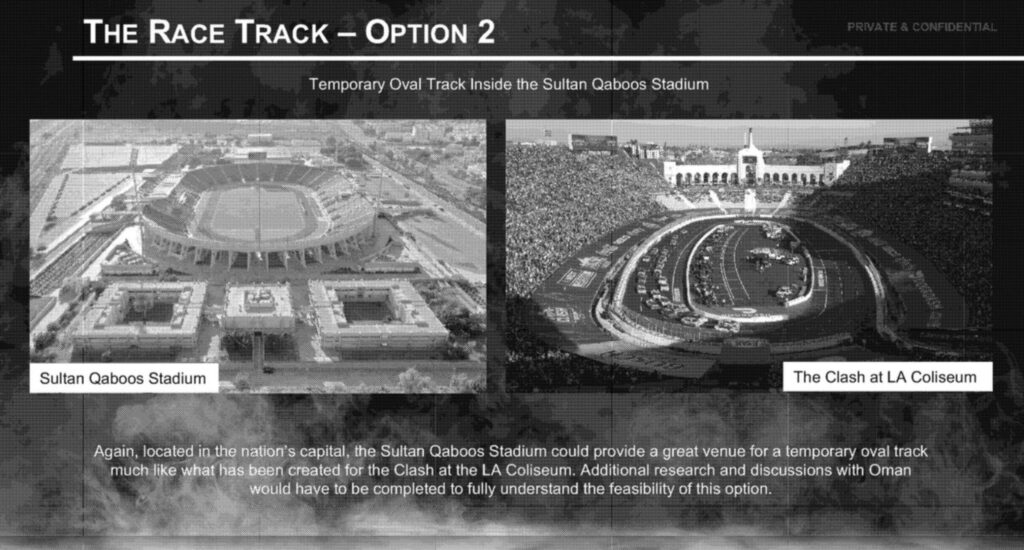 The stadium race, however, was a direct comparison to NASCAR, with NASCAR’s 2022 race at the LA Memorial Coliseum as inspiration for a potential race at Sultan Qaboos Sports Complex.