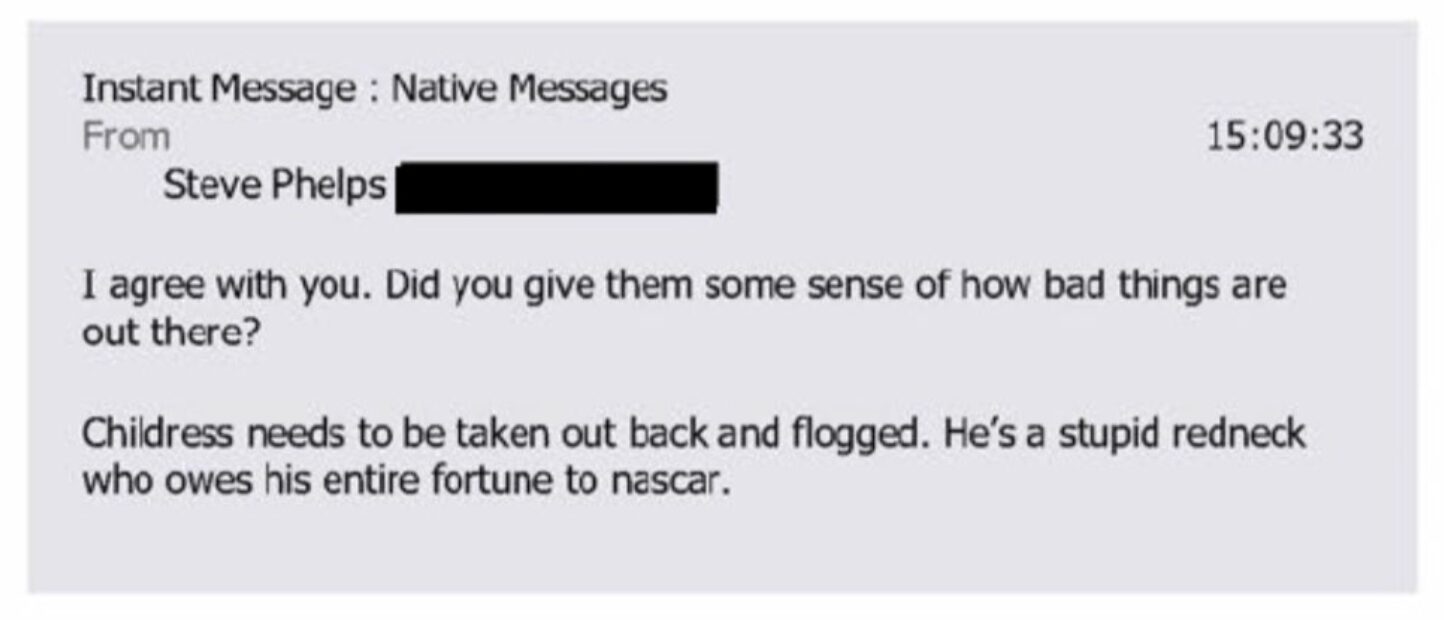 But, Phelps didn’t stop there, saying that Childress was a “stupid redneck who owes his entire fortune to nascar.” Furthermore, Phelps later stated that if Childress dislikes the state of NASCAR, he should sell his charters and leave.