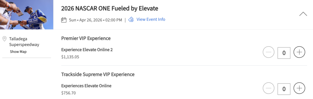 - Of course, this VIP Package comes with a hefty cost. The cheaper of the two options listed on Ticketmaster, the Trackside Supreme VIP Experience, runs $756.70 per person, while the Premier VIP Experience runs $1,135.50 per person.