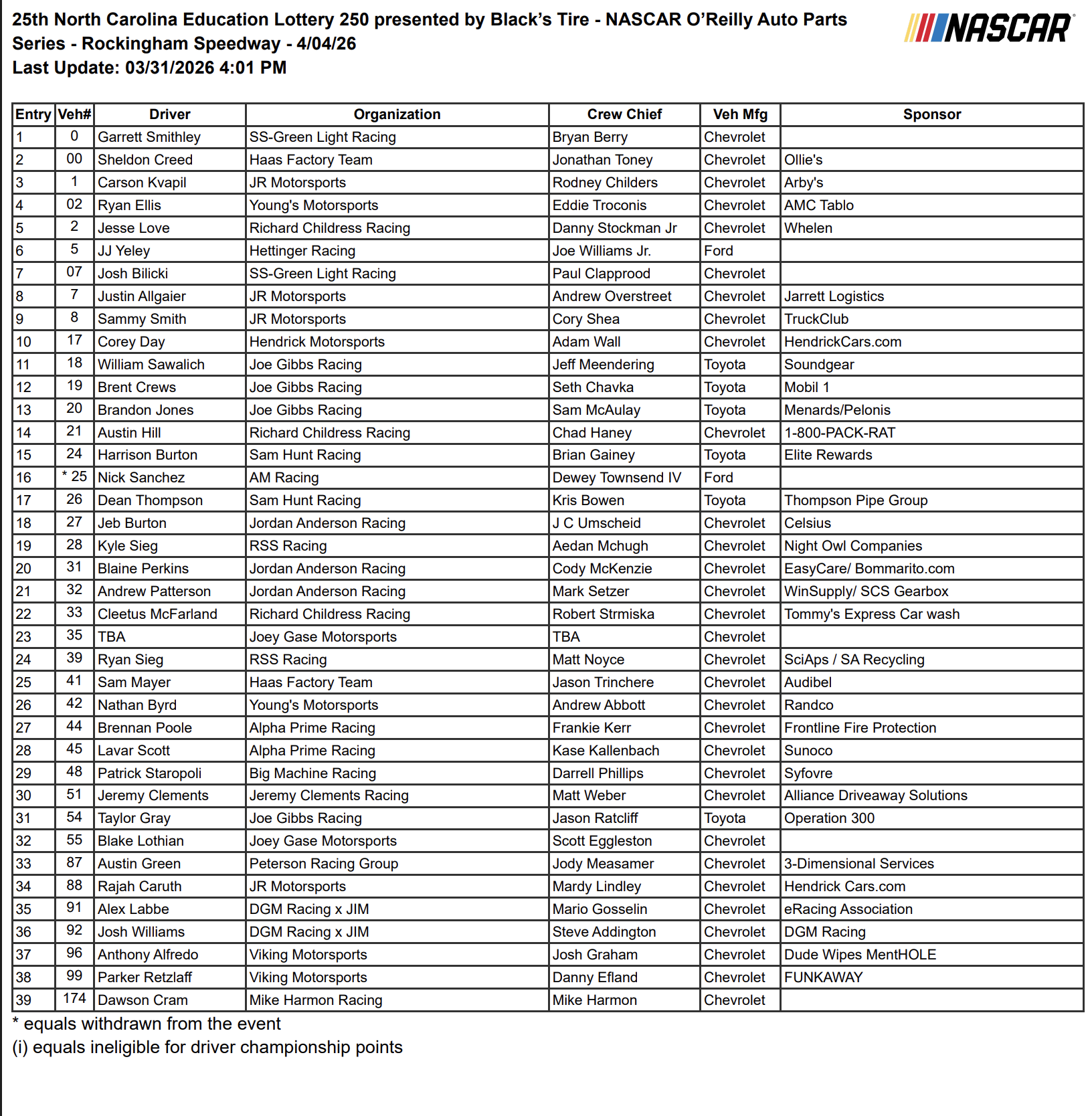 - This move came seemingly out of nowhere, with the team having a spot on the preliminary entry list on Monday afternoon. But, fans and media members quickly took notice when an updated list from Tuesday afternoon featured a star by the No. 25, which shows they have withdrawn.