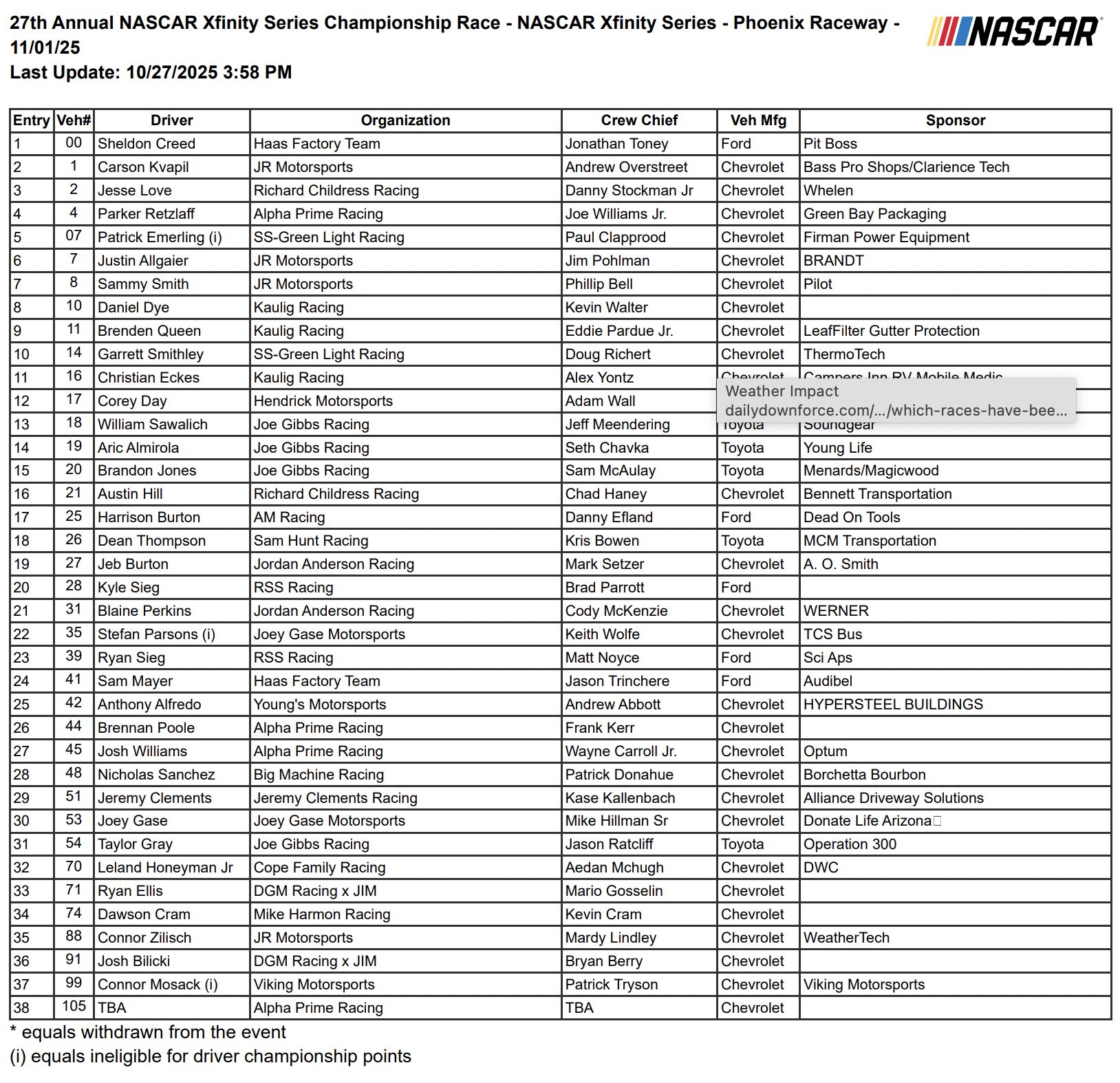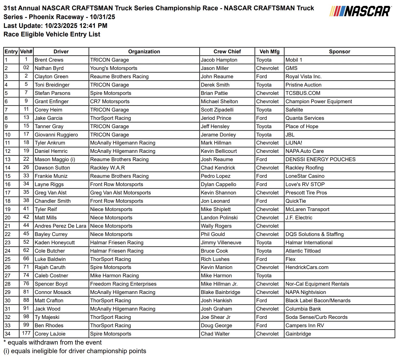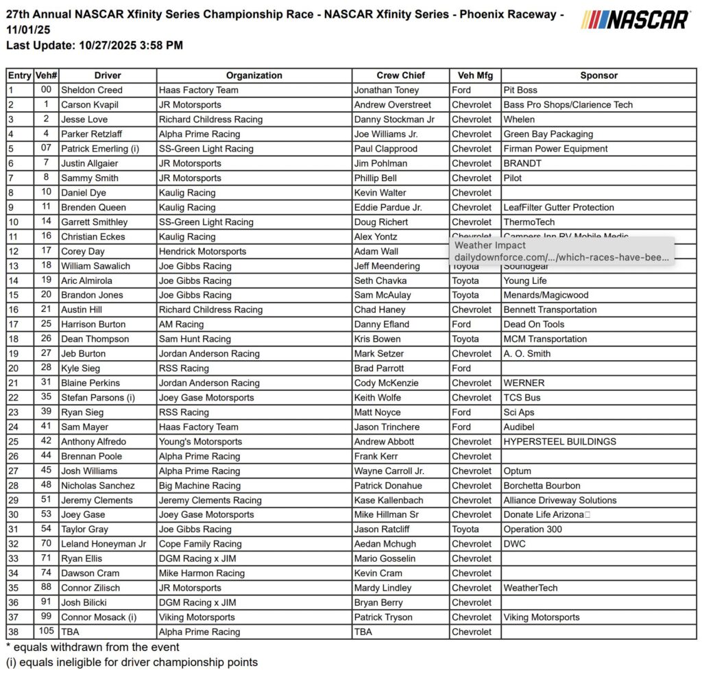 Friday, October 31: Truck Series Qualifying | Xfinity Series Practice | Cup Series Practice | Truck Series Race