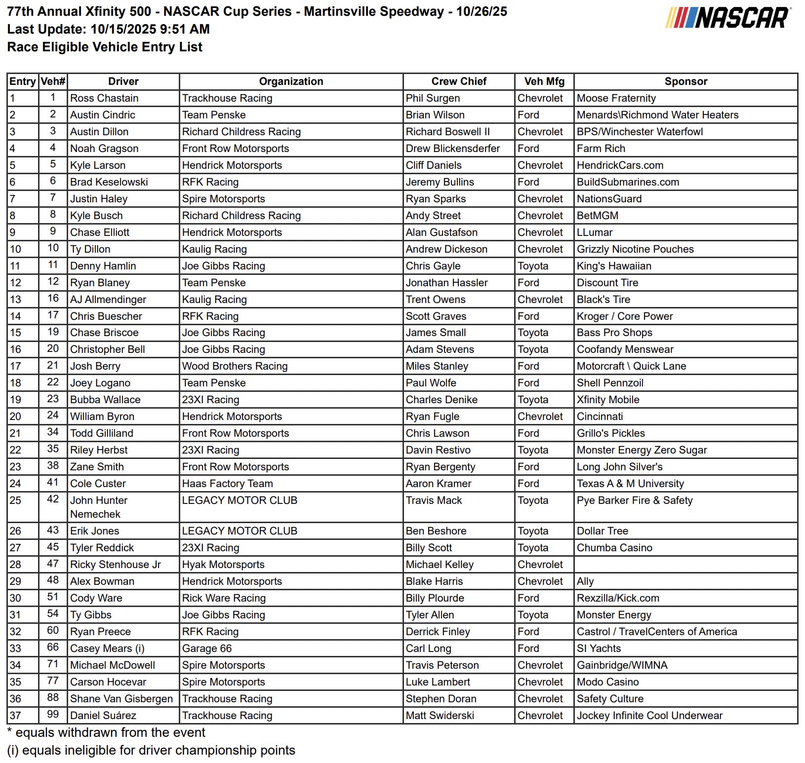 - Denny Hamlin leads all active full-time NASCAR Cup Series drivers in wins at Martinsville, having won his sixth race at the track earlier this season. Despite his winning ways, Hamlin has yet to win a playoff race at Martinsville, with Ryan Blaney as the only driver to win the fall race more than once (2023 and 2024) since the system’s introduction in 2014.