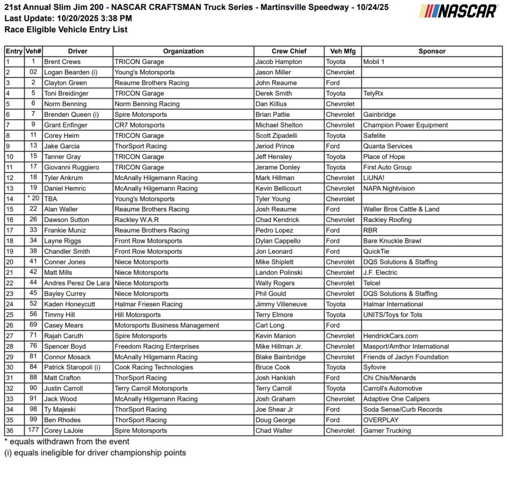 - First, the Craftsman Truck Series, where season dominator Corey Heim is already locked into the Round of Four, with no playoff driver winning last weekend at Talladega. This weekend, Rajah Caruth, Tyler Ankrum, Kaden Honeycutt, and an unlikely bunch sit above the cutline. Below sit season standouts like Daniel Hemric and Layne Riggs, and finally, Grant Enfinger. This could be the most chaotic race of the weekend, as no driver is out of advancing without a win.