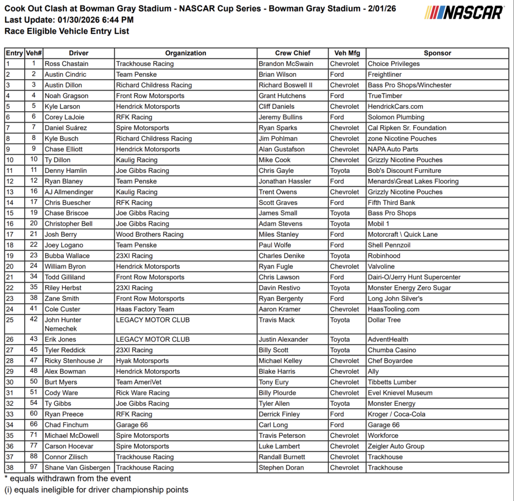 Before the 2026 NASCAR season kicks off at Daytona, the stars of the NASCAR Cup Series head to historic Bowman Gray Stadium in Winston-Salem for the annual Cook Out Clash exhibition race.