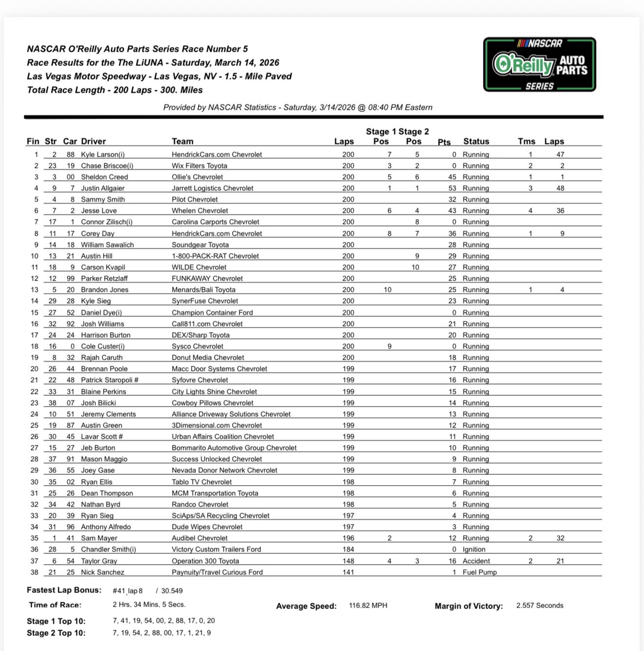 This win marked JRM’s 107th victory, their 5th win at Las Vegas, and Larson’s 18th O’Reilly Auto Parts Series win. That also marked their third straight win to kick off 2026. It was a stellar day overall for JR Motorsports. Larson won the race. Justin Allgaier finished 4th. Smith finished 5th. Zilisch finished 7th. And Carson Kvapil brought it home in the 11th position.
