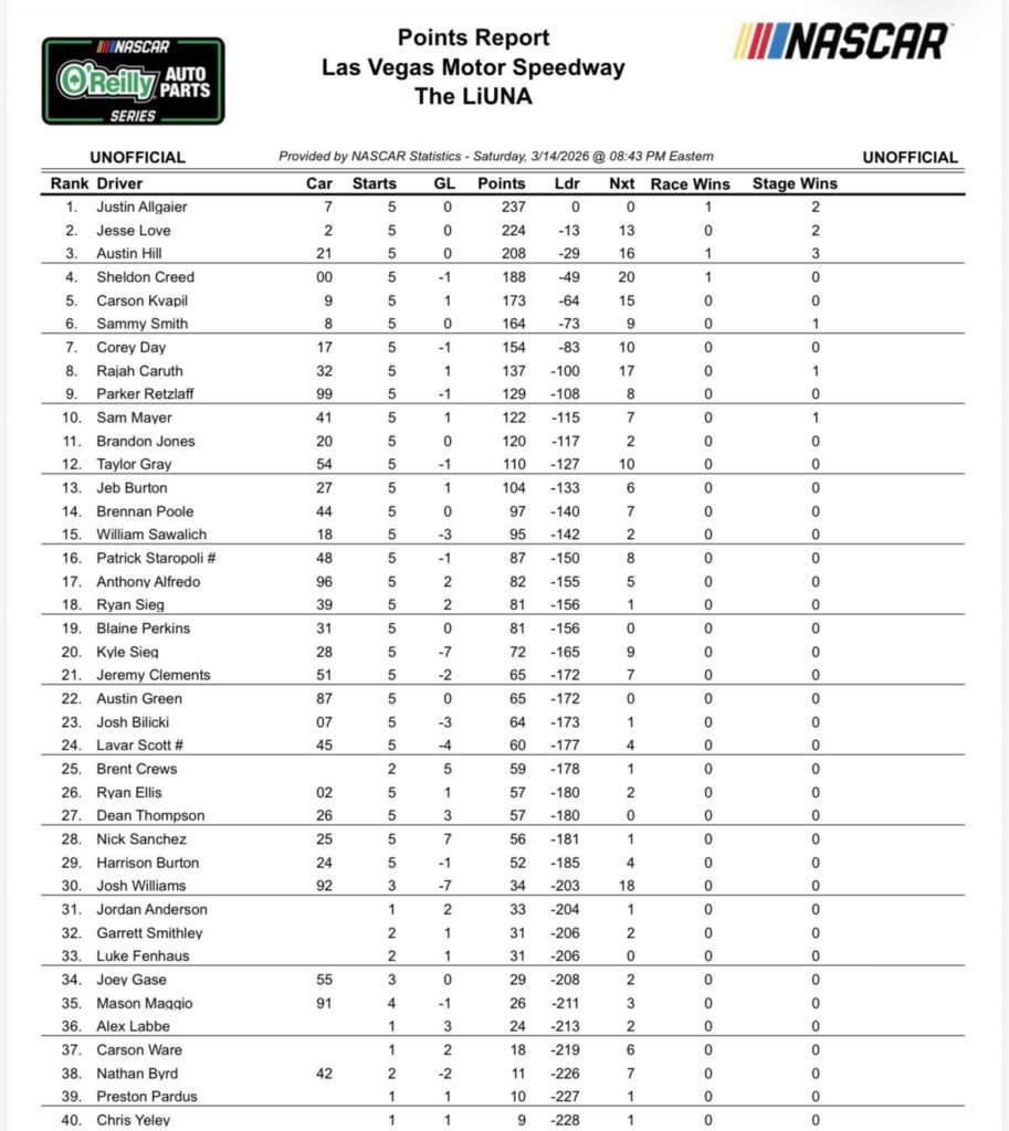 The checkered flag is out. That does it for the LiUNA! at Las Vegas, the fifth round of the 2026 season for the NASCAR O’Reilly Auto Parts Series. Early on in this race, it looked like it was a foregone conclusion that Justina Allgaier had the best car and was going to cruise to victory lane. However, as the race wore on, Allgaier’s car got a little too snug for comfort. And, despite adjustments on pit road, it was clear that the No. 7 had faded some in the closing laps of the race.