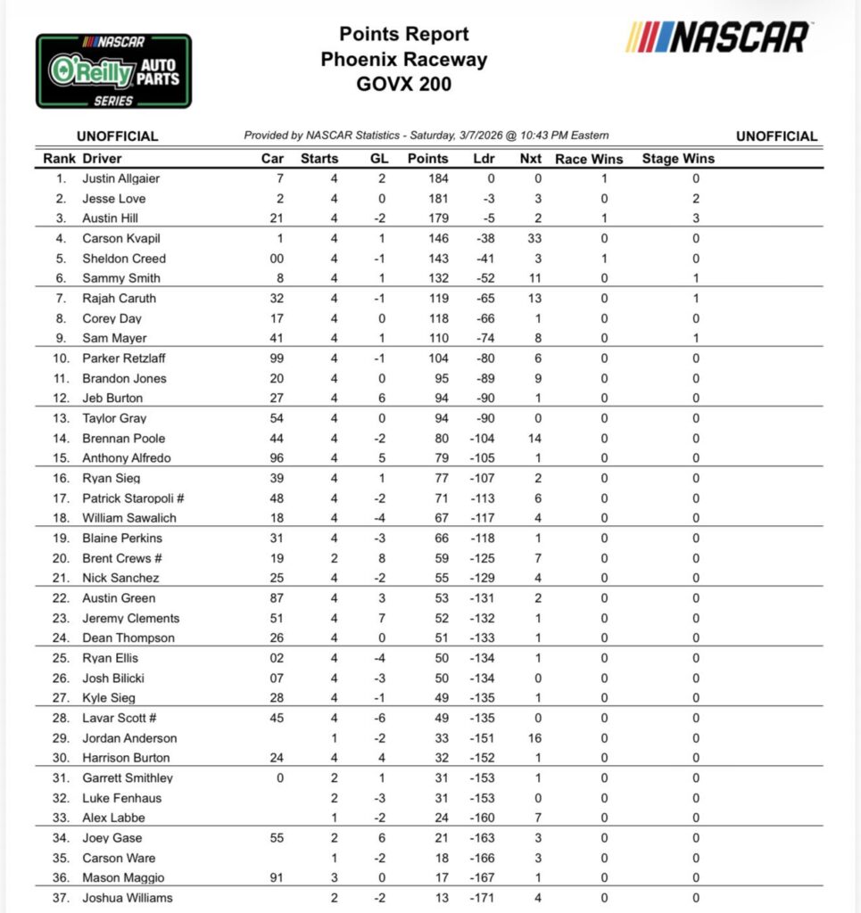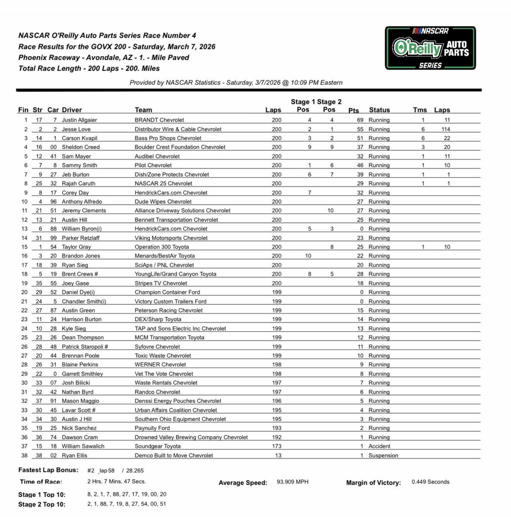 The checkered flag has waved for the NASCAR O’Reilly Auto Parts Series at Phoenix Raceway. The first race of the 2026 abbreviated West Coast Swing is officially in the books. Considered the first “real” race of the campaign, it gave us a little bit better sample size as to where everyone is. At the end of it all, it was Phoenix Ace, Justin Allgaier, who was left standing tall as your race winner. This marked the second win in a row for JR Motorsports. Additionally having great points days were Jesse Love, Sheldon Creed, Carson Kvapil, and Sammy Smith. Here are the biggest takeaways from the GOVX 200 at Phoenix Raceway.