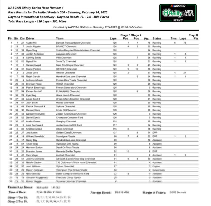 The 2026 season-opening race at Daytona is officially in the books for the NASCAR O’Reilly Auto Parts Series. We had some wild, action-packed moments throughout, with the cream rising to the top as everyone else boiled over. In the end, it was, predictably, Austin Hill who took the first checkered flag of the season. It marked his fourth win at Daytona, all coming in the season opener, and his eleventh superspeedway win in all. In the process of winning the race, he led the pack most of the night, leading 78 of the 120 laps and sweeping the stages. That gives him 75 points to start the year.