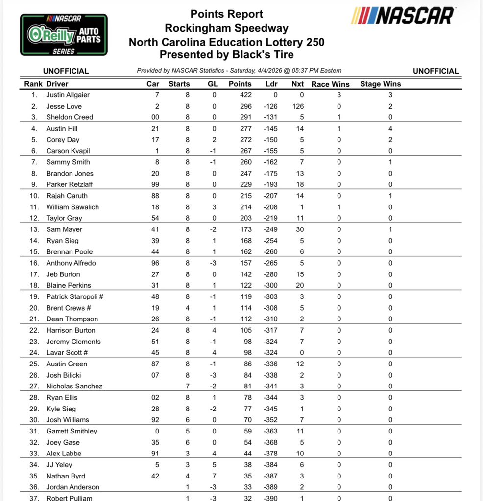 - The following drivers all earned stage points today: Corey Day (20), William Sawalich (15), Justin Allgaier (15), Brandon Jones (14), Taylor Gray (9), Brent Crews (9), Rajah Caruth (8), Jesse Love (5), Parker Retzlaff (5), Sammy Smith (4), Sheldon Creed (3), Jeremy Clements (2), and Carson Kvapil (1).